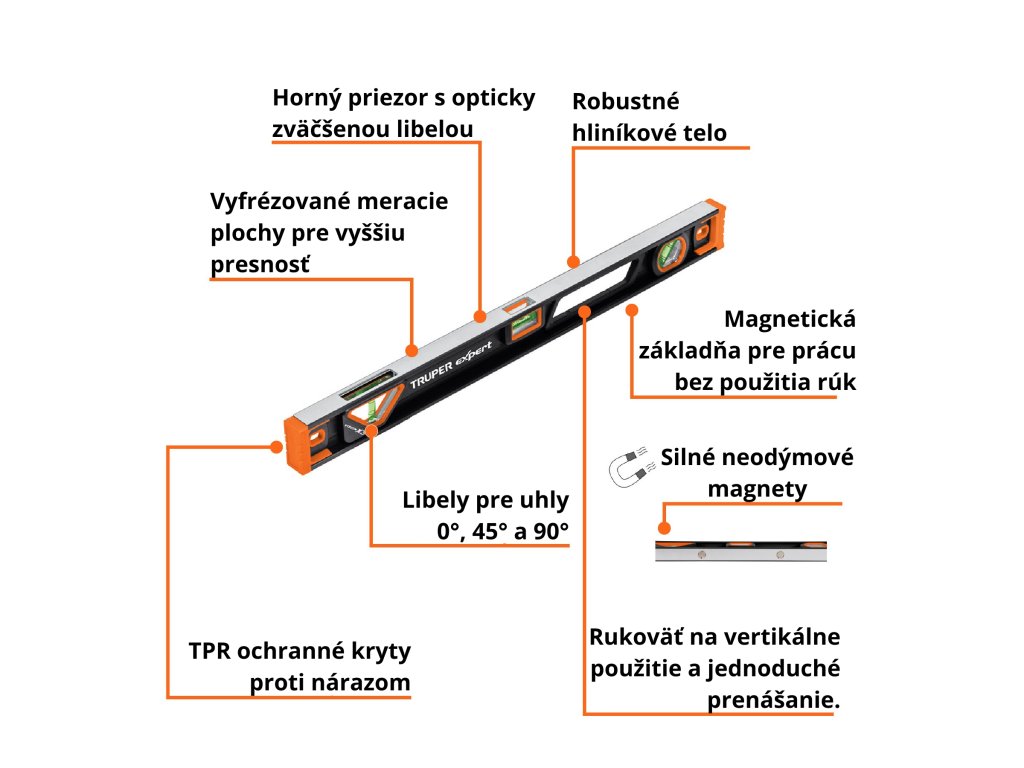 Vodováha TRUPER NP-24X: 60 cm profesionálna hliníková vodováha s magnetickou základňou, ochranou TPR (termoplastická guma) proti nárazom a tromi vysokokontrastnými libelami pre presné meranie v uhlových polohách 0°, 45° a 90°.