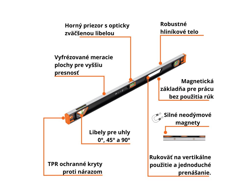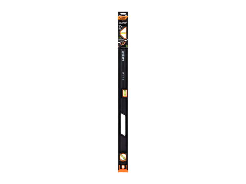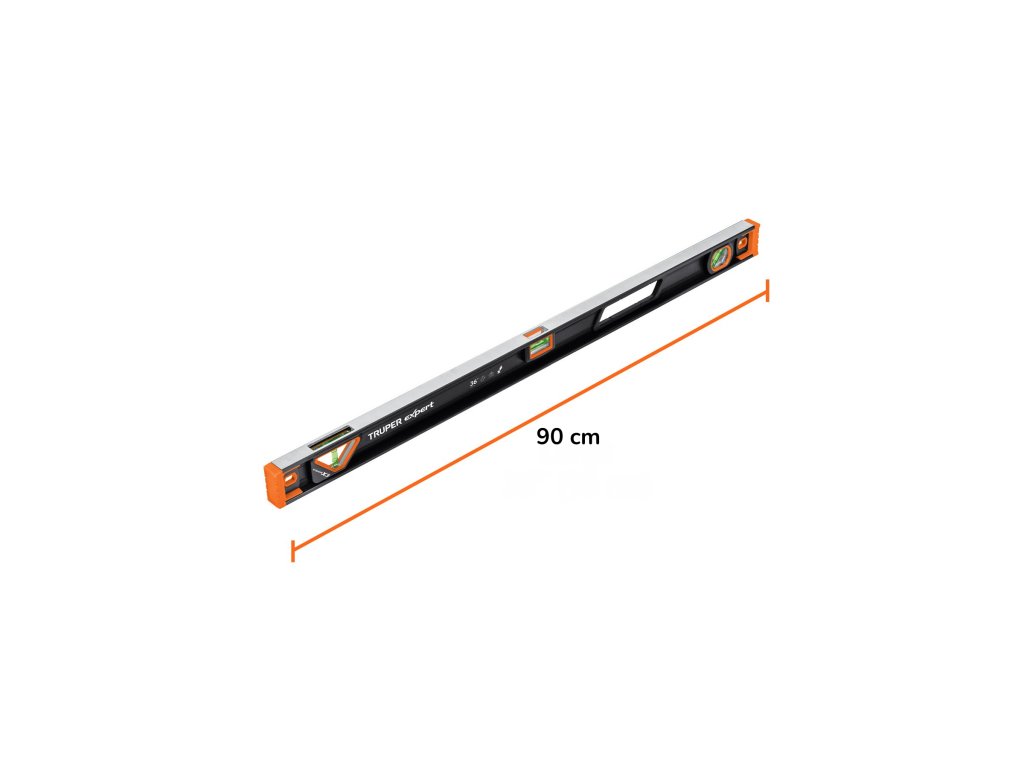 Vodováha TRUPER NP-36X: 90 cm profesionálna hliníková vodováha s magnetickou základňou, ochranou TPR (termoplastická guma) proti nárazom a tromi vysokokontrastnými libelami pre presné meranie v uhlových polohách 0°, 45° a 90°.