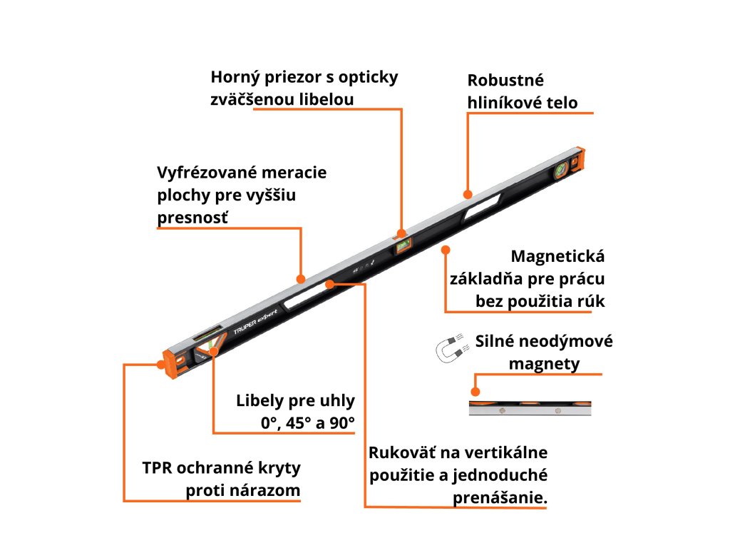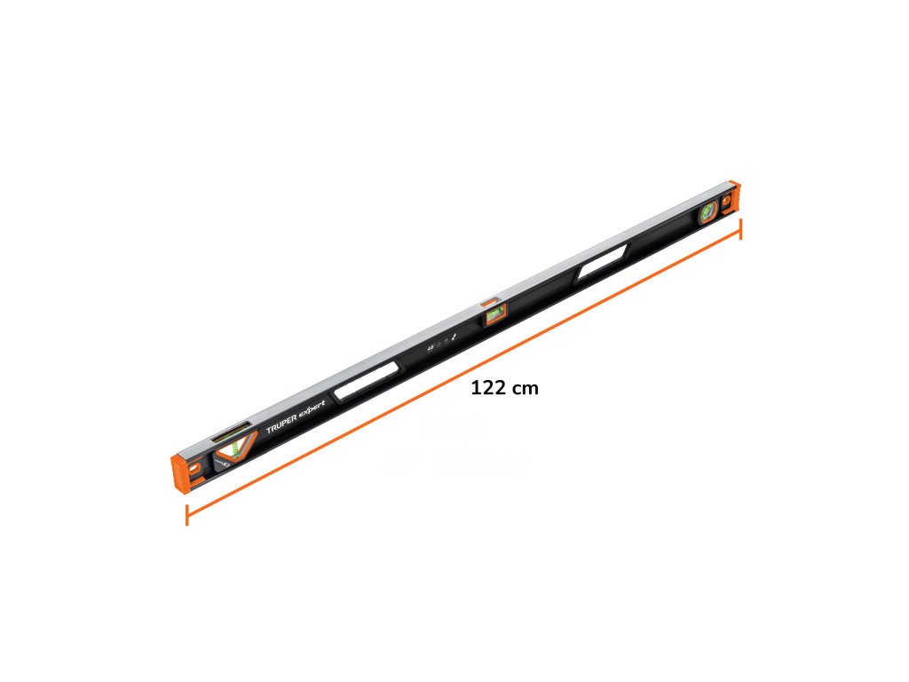 Vodováha TRUPER NP-48X: 120 cm profesionálna hliníková vodováha s magnetickou základňou, ochranou TPR (termoplastická guma) proti nárazom a tromi vysokokontrastnými libelami pre presné meranie v uhlových polohách 0°, 45° a 90°.