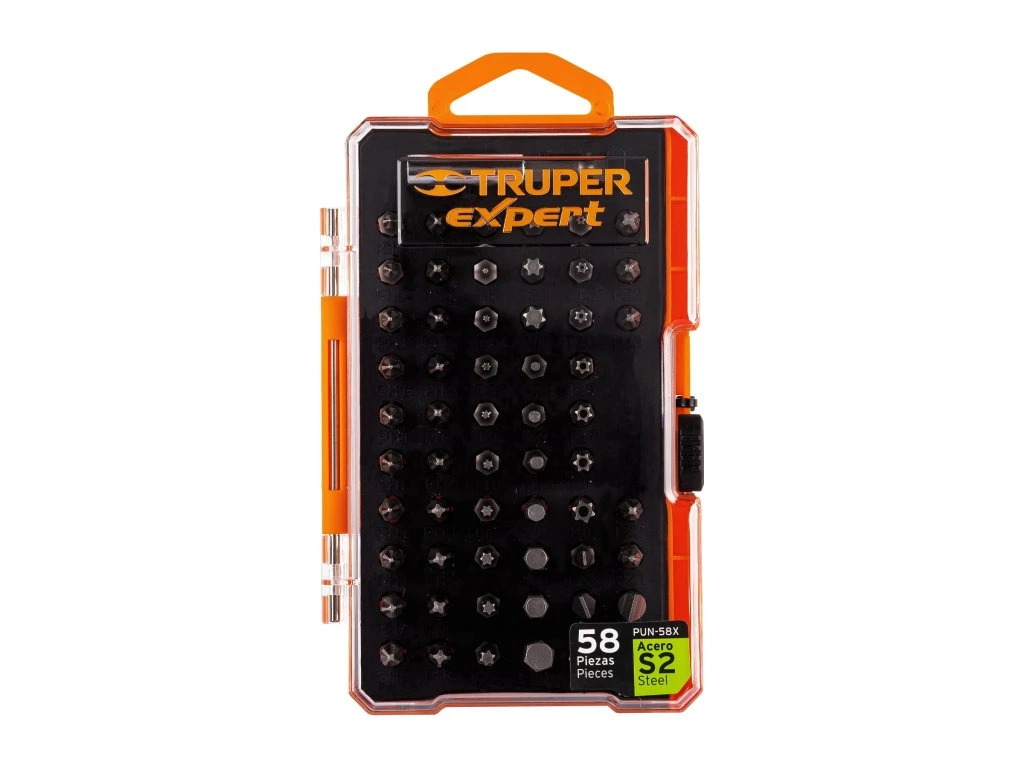 TRUPER Expert – Sada bitov PUN-58X: 58 ks, S2 oceľ, 25 mm, s magnetickým držiakom: Univerzálna sada bitov z odolnej ocele S2 s presným opracovaním, vhodná pre ručné aj elektrické náradie.