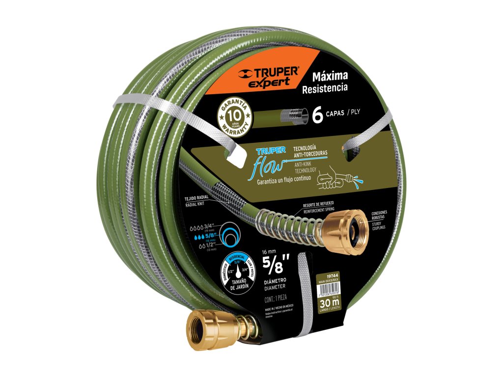 Záhradná hadica TRUPER eXpert MAN-30X5/8XX: profesionálna 30 m hadica s priemerom 5/8″, 6-vrstvová konštrukcia s mosadznými koncovkami a pružinovým vystužením proti zalomeniu, ideálna pre intenzívne záhradnícke a priemyselné použitie.