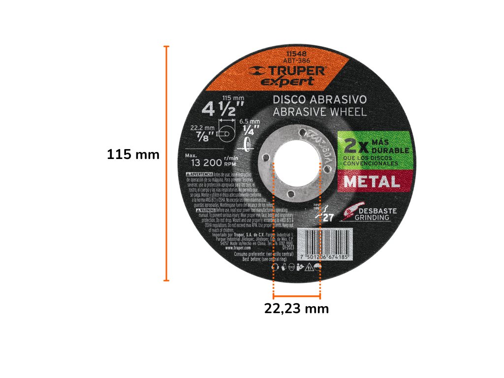 Brúsny kotúč TRUPER eXpert ABT-386: priemer 115 mm, typ 27, určený na brúsenie kovových materiálov.