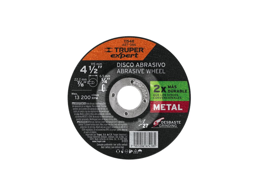 Brúsny kotúč TRUPER eXpert ABT-386 je určený pre uhlové brúsky a efektívne opracovanie kovových povrchov. Priemer 115 mm a tvar typu 27 umožňujú rýchle a presné brúsenie. Kotúč je odolný a vhodný na intenzívne použitie v dielni aj pri profesionálnych úlohách.