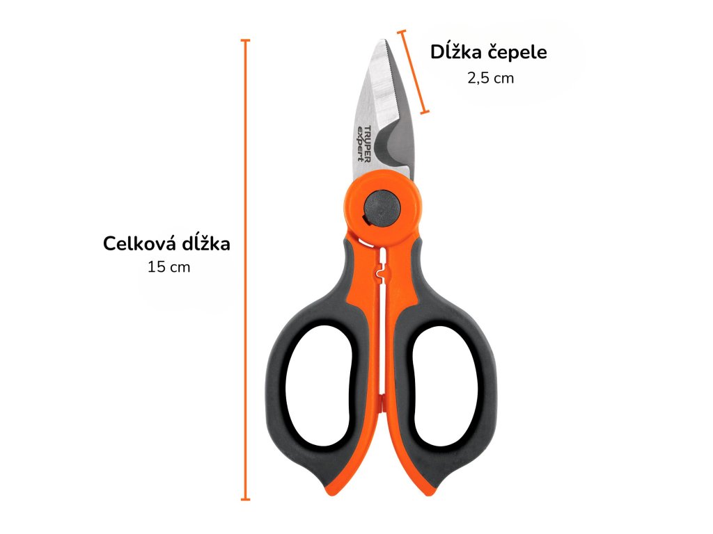TRUPER eXpert TIEL-6: Profesionálne nožnice pre elektrikárov. Zúbkovaná čepeľ z nerezovej ocele pre presné strihanie káblov do priemeru 8 AWG. Vďaka nastaviteľnej skrutke a lisu na koncovky sú ideálne pre každodenné použitie v elektrotechnike. Pohodlné rukoväte a praktické puzdro sú samozrejmosťou.
