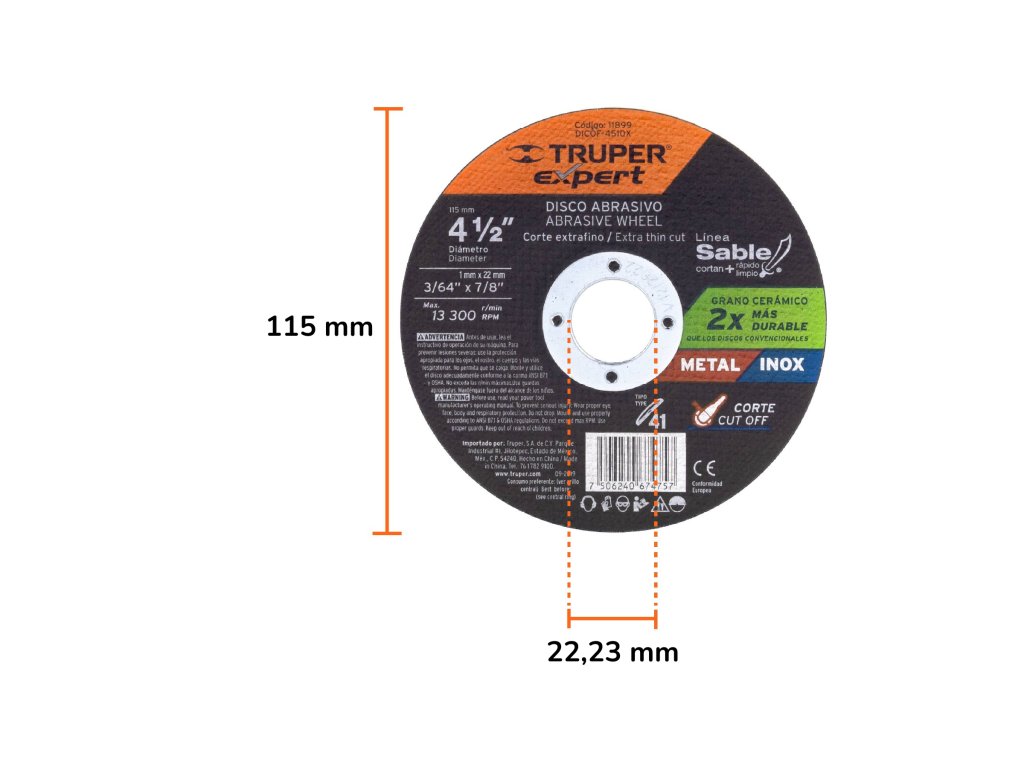 Rezný kotúč TRUPER eXpert DICOF-4510X: priemer 115 mm a hrúbka 1 mm, určený na presné rezanie kovu a nerezu.