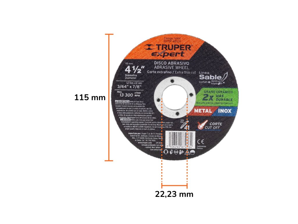 Rezný kotúč TRUPER eXpert DICOF-4512X: priemer 115 mm a hrúbka 1,2 mm, určený na rezanie kovu a nerezu.