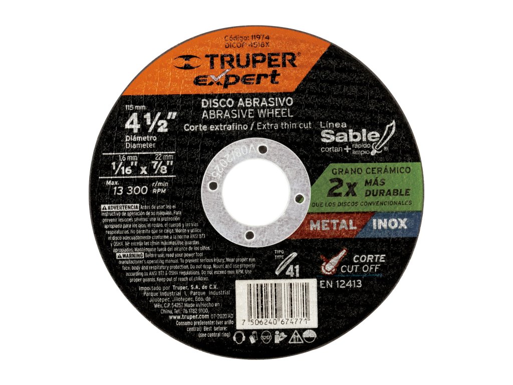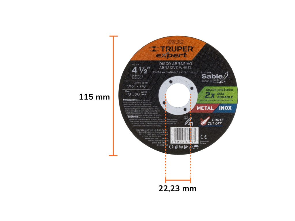 Rezný kotúč TRUPER eXpert DICOF-4516X: priemer 115 mm a hrúbka 1,6 mm, určený na rezanie kovu a nerezu.