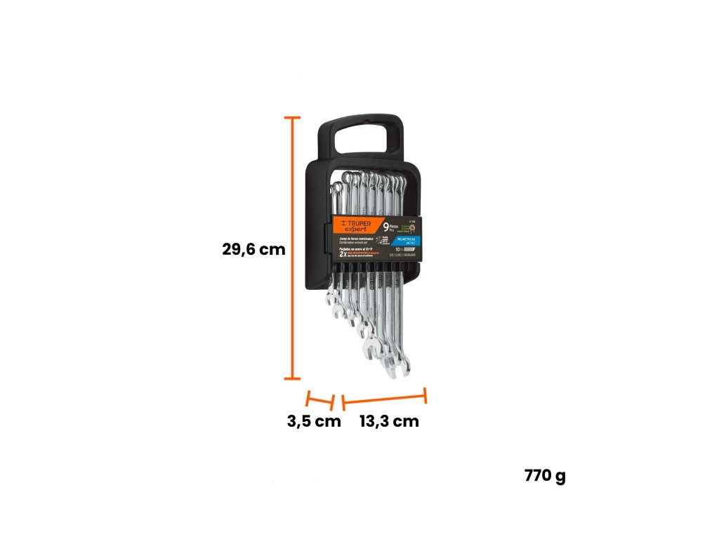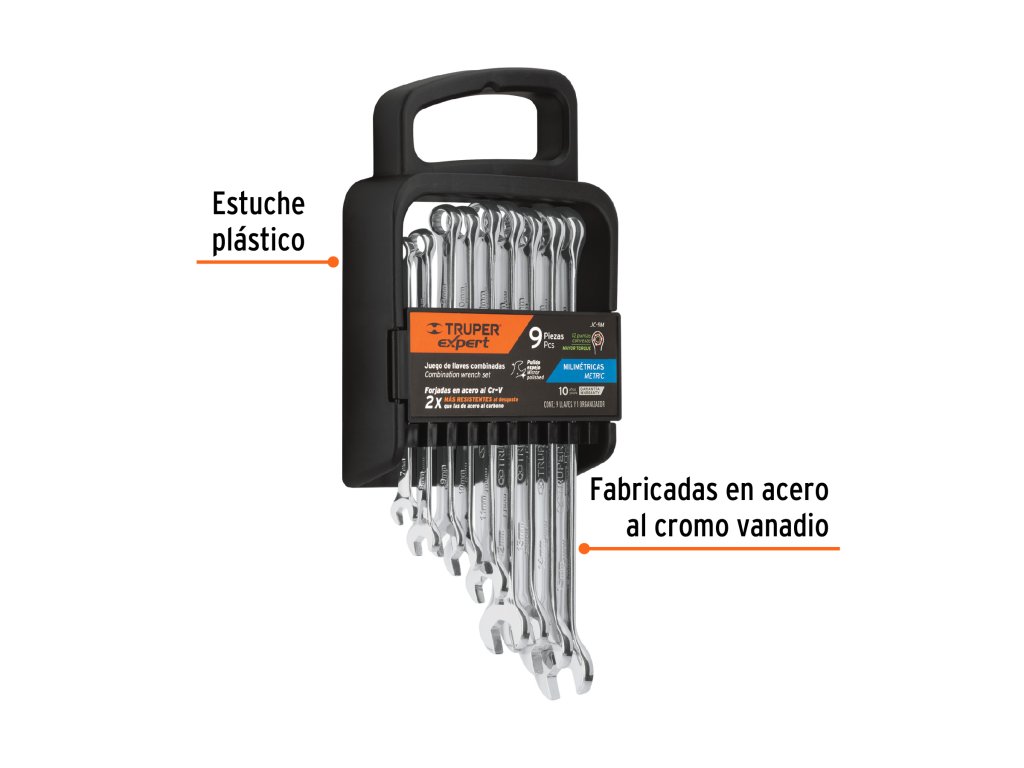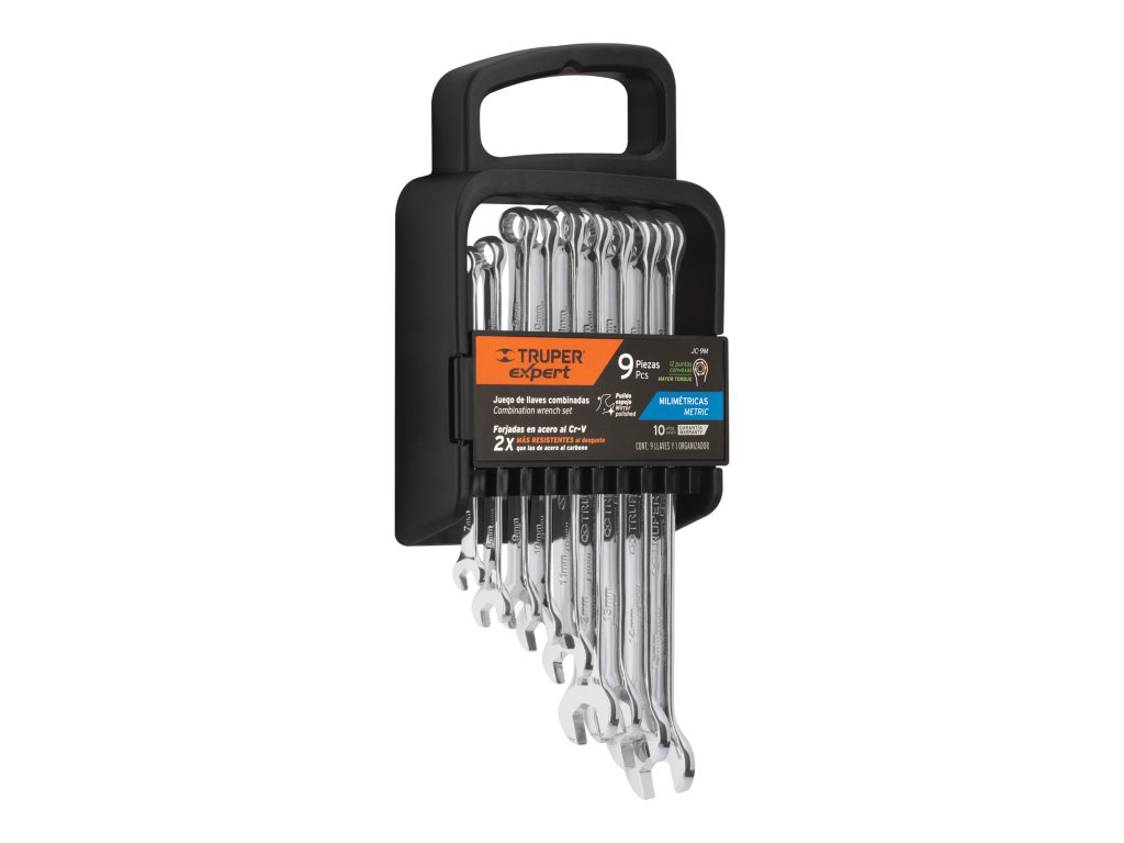 Sada očkoplochých kľúčov TRUPER eXpert JC-9M: 9-dielna metrická sada kľúčov z chróm-vanádiovej ocele, určená pre profesionálne použitie.