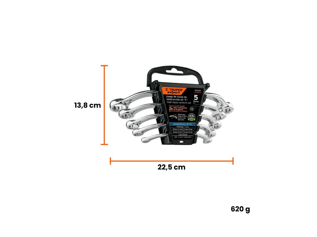 Sada ohnutých očkových kľúčov TRUPER eXpert JO-5M-X je určená pre prácu v úzkych a ťažko dostupných priestoroch. Obsahuje 5 kusov metrických kľúčov vyrobených z odolnej chróm-vanádiovej ocele, ktoré poskytujú vysokú pevnosť a presnosť. Ohnutý tvar umožňuje lepší prístup k maticiam a skrutkám tam, kde klasické kľúče nestačia. Praktické balenie zabezpečuje jednoduché uloženie a prenos.