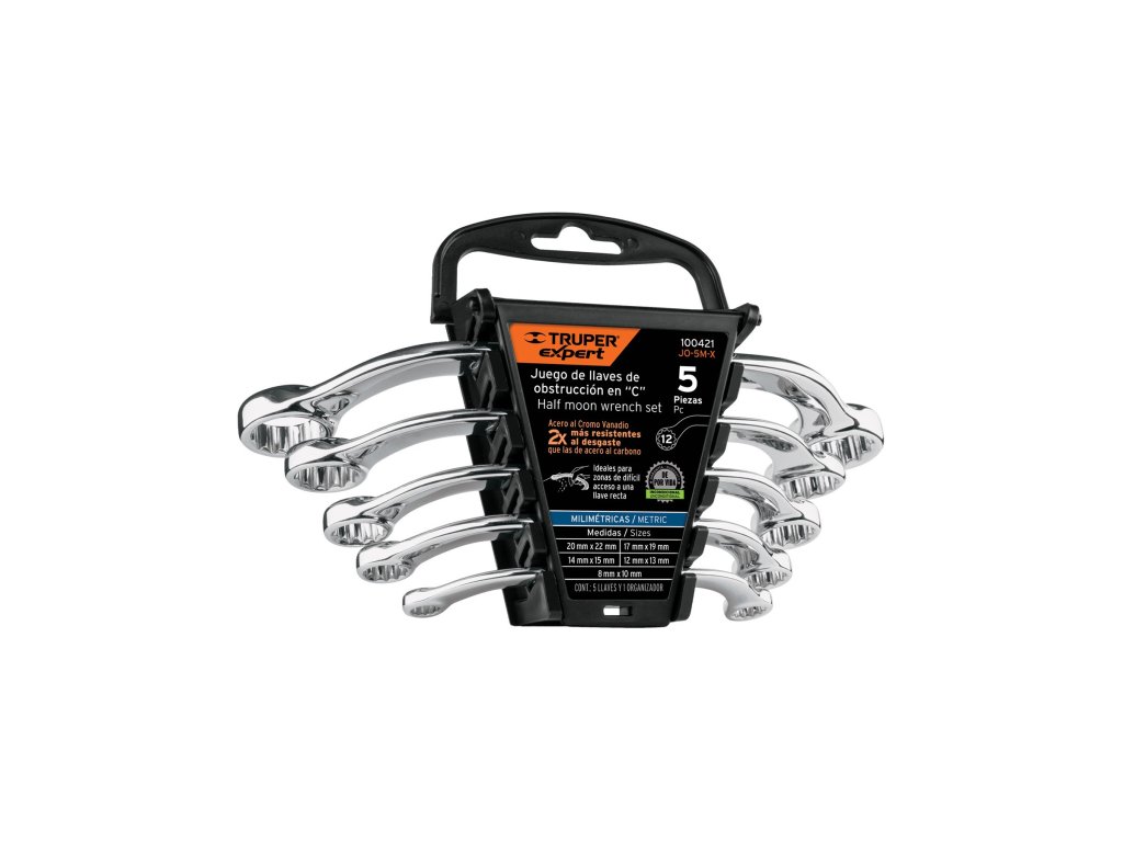 Sada ohnutých očkových kľúčov TRUPER eXpert JO-5M-X: 5-dielna metrická sada kľúčov s ohnutým tvarom pre prácu v ťažko dostupných priestoroch.