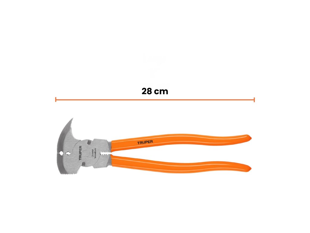 Kliešte na pletivo TRUPER PACE-11: dĺžka 280 mm, chróm-vanádiová oceľ s leštenou hlavou a PVC rukoväťou pre pohodlný úchop.