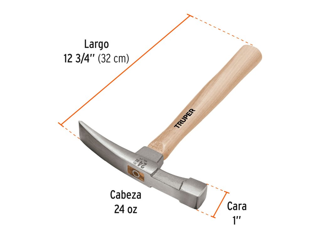 Murárske kladivo TRUPER ML-24: profesionálne murárske kladivo s oceľovou hlavou 680 g, plochou úderovou stranou a sekáčovou stranou na opracovanie tehál, s drevenou rukoväťou 32 cm.