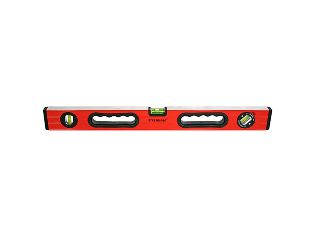 Vodováha Strend Pro LE-99R má protišmykové gumové hrany, jemné držiaky, vrúbkovanú hornú a dolnú hranu a nastaviteľnú libelu na meranie uhlov.