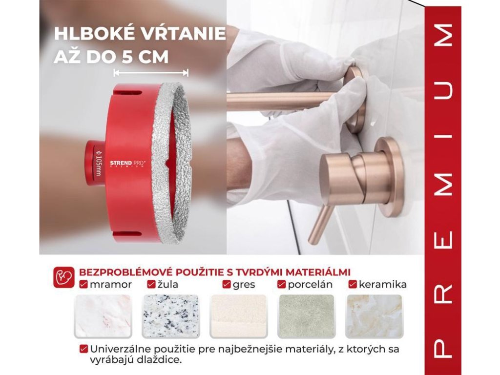 Vyrezávač Strend Pro Premium je vhodný na vyrezávanie všetkých druhov tvrdeného kameňa a jeho zlúčenín, keramických dlaždíc, mramoru, gresu, porcelánu a žuly. Špičkový proces spájania diamantov zabezpečuje vysokú odolnosť voči vysokým teplotám a predlžuje životnosť. Extrémne ľahké rezanie a vysoká výkonnosť pri vykružovaní. Perfektne ho využijete pri montáži kúpeľnovej sanity a príslušenstva, inštalácii káblov, elektrického vedenia, radiátorov atď. Je použiteľný s akoukoľvek vŕtačkou s použitím vhodného adaptéru. Typ upínania: M14, Ø vyrezávača je 105 mm.