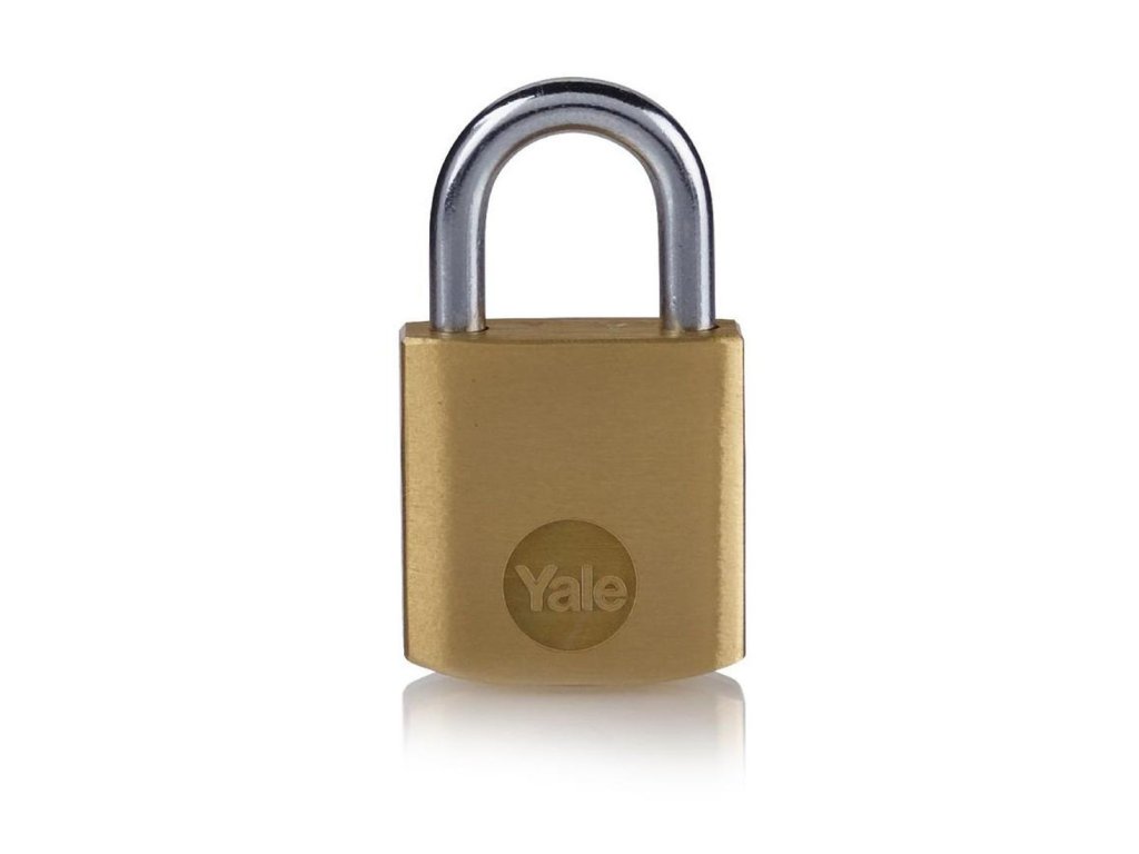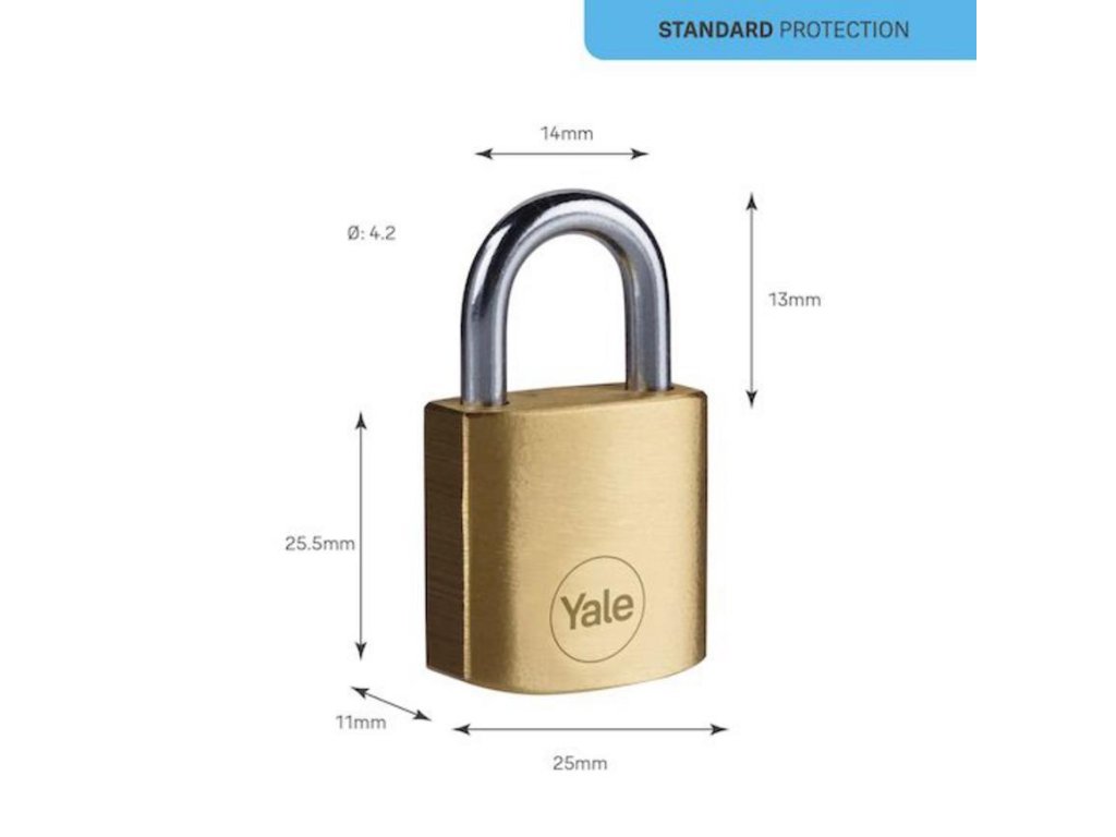 Visiaci mosadzný zámok Yale so šírkou 25 mm so štandardným stupňom zabezpečenia. Testovaný na odolnosť proti korózii až 96 hodín, aby poskytovali ochranu proti rôznym poveternostným podmienkam. Balenie obsahuje 3 kľúče.