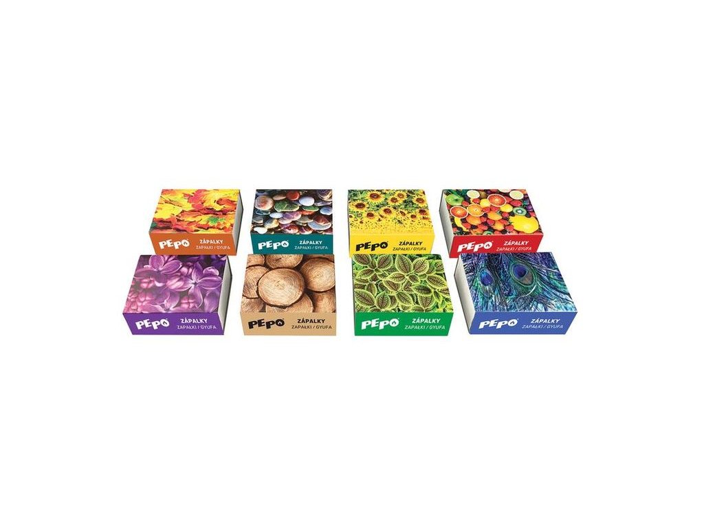 PE-PO zápalky v 8 rôznych krabičkách, 55mm, v balení 100 ks.