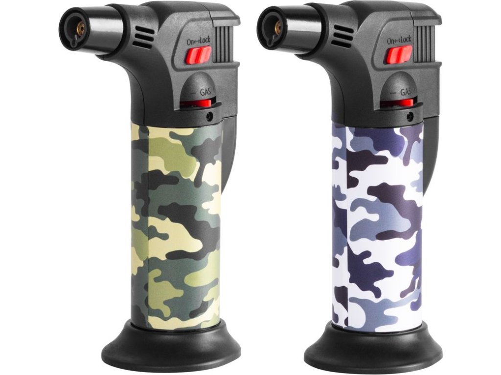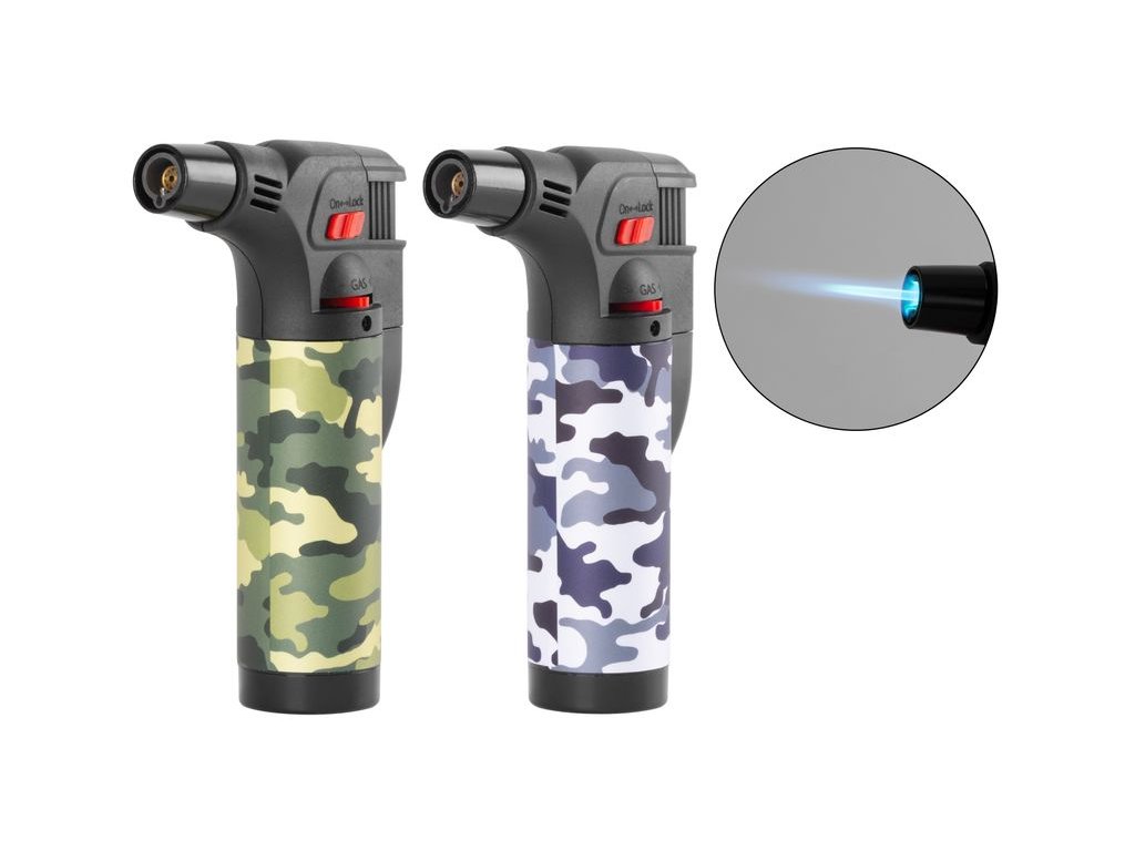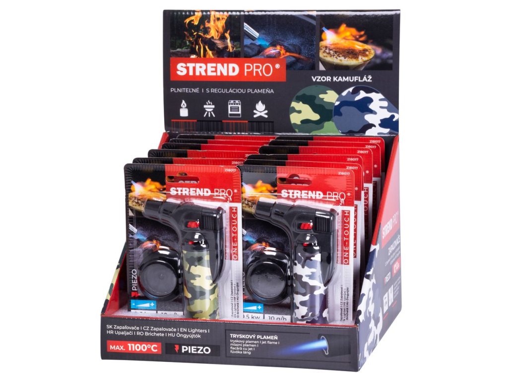 Zapaľovač Strend Pro Mini horák so stojanom, kamufláž, plniteľný, 75x45x120 mm, Sellbox 12 ks